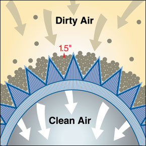 | 短而硬的創(chuàng)新濾材褶裥,大大提高了粉塵捕捉和清灰效率。通過(guò)減短濾筒的褶高:從標(biāo)準(zhǔn)的50mm (2英寸) 縮短至38mm (1.5英寸),使褶壁不易折疊或彎曲,令攔截下來(lái)的粉塵更易被清出。 |
