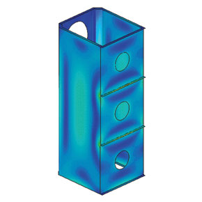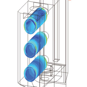 先進(jìn)的FLUENT軟件模擬流體動(dòng)力學(xué),結(jié)構(gòu)力學(xué)和聲學(xué)分別模擬了DFO型號(hào)1-1,2-2,3-3的性能等級(jí)。而下面(左圖)顯示了利用FLUENT軟件作流量測(cè)試,從而令DFO 3-3內(nèi)部的氣流速度更均勻分布。另外下右圖顯示了利用ANSYS®*結(jié)構(gòu)分析軟件測(cè)試DFO 3-3,在正常工作壓下之內(nèi)部壓力分布測(cè)試。