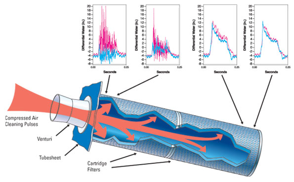 ExtraLife脈沖清灰系統(tǒng)采用專(zhuān)有的模擬脈沖清灰技術(shù)來(lái)設(shè)計(jì),令粉塵可以輕松地從濾筒表面吹掉,從而提高過(guò)濾效率,延長(zhǎng)濾材的使用壽命。圖中紅色曲線顯示ExtraLife系統(tǒng)在DFO前排濾筒產(chǎn)生的壓力增加。而藍(lán)色曲線則表示普通濾筒的脈沖反吹表現(xiàn)。